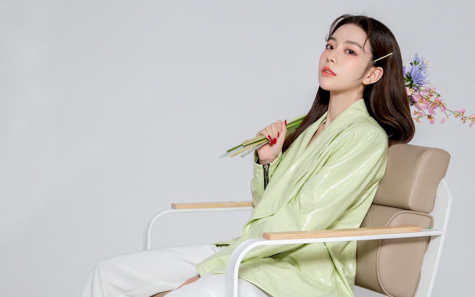 加上挺翘的嘴唇上涂着亮粉色的唇膏,散发着青春靓丽的气息。