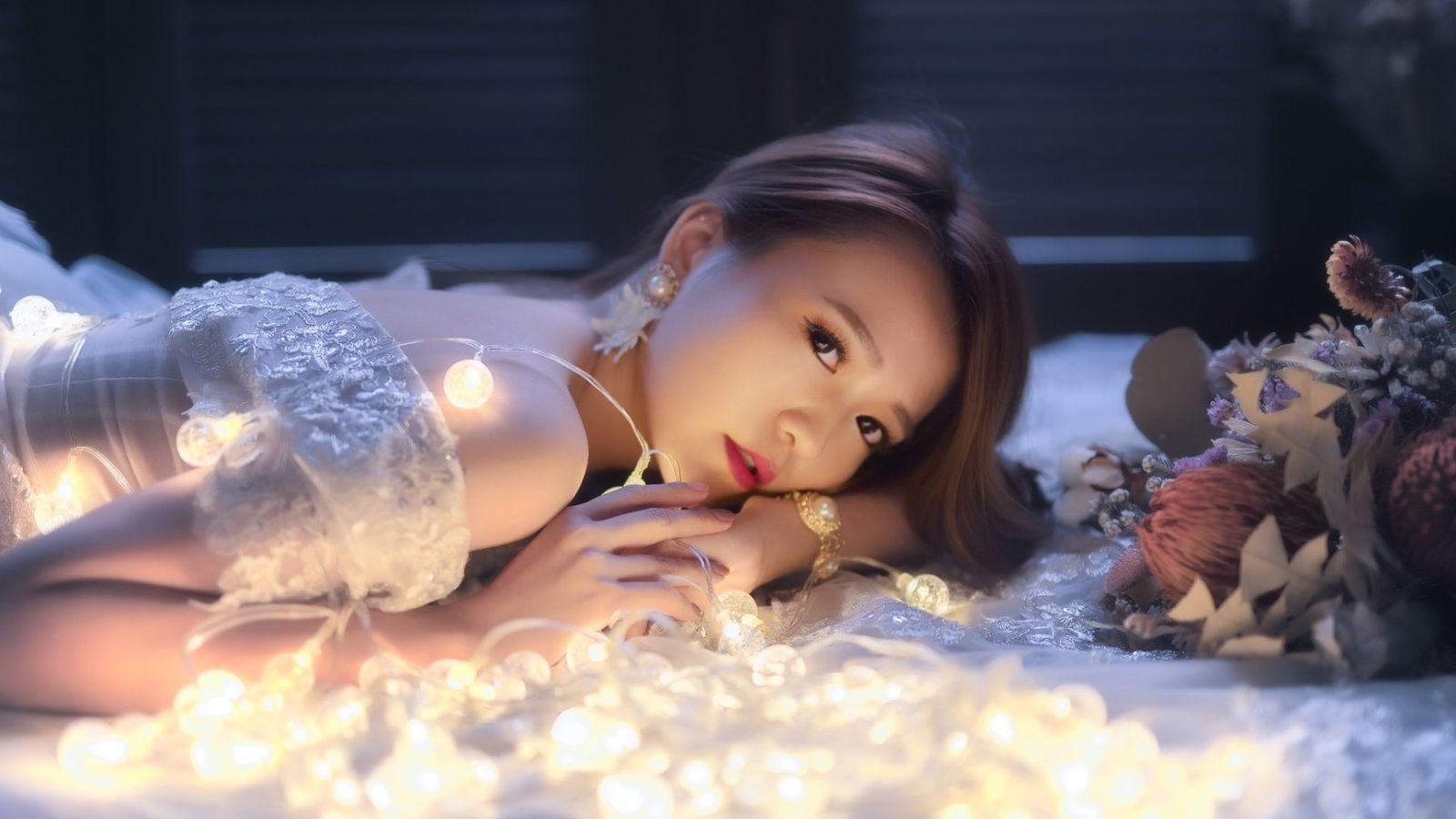此时的沐雪吟以一个美人卧的姿势横着躺在床头,身上穿着一身颇具古风的清凉汉服,上身是一身粉色丝质针织抹胸,抹胸上面纹着一朵洁白的梅花。下身则光溜溜的,只在腰间披着一条透视性极强的淡粉色薄纱,透过薄纱,能够看到里面只有一条同样是粉色的小内裤,连系在腰臀上的丝带都清晰可见。沐雪吟左手手肘支撑着床面,将小巧的头颅依靠在玉臂上,绝美的娇颜上带有一丝娇羞而产生的红晕,一双会说话的美眸满怀柔情凝视着直勾勾看着自己的丈夫,长长的睫毛轻颤,似乎有无数的情话想要倾诉。