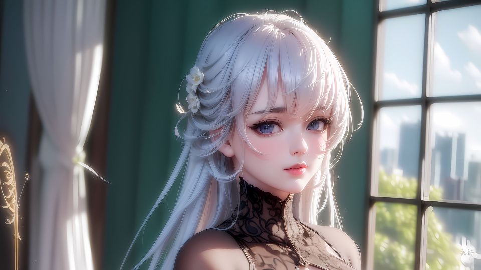 倾露仙子前额两侧寥寥垂下几缕青丝,头顶后扎着的马尾让仙子本就高挑的身形又显高了几分,本是简简单单的发型在仙子身上尽显高贵优雅,细长的弯眉下一双丹凤眼清澈又明亮,眉心连接着曲线精致的俏鼻,嘴角带着一丝自然的微笑,小巧红润,像两片带露的花瓣。
