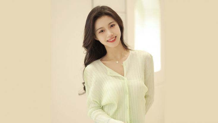 脖子上戴着一条精致的珍珠项链,为整体造型增添了一丝优雅和高贵。唐曼月化了一个精致的淡妆,眉毛细长上挑,眼角微微上扬,眼线勾勒出她深邃迷人的眼眸,鼻梁高挺,鼻头小巧玲珑,嘴唇饱满性感,涂着豆沙色的口红,显得气色很好。