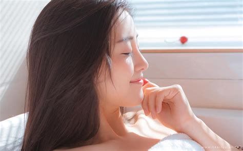 她的黑发随意地披散在肩头,脸上带着一丝慵懒的笑意,看起来刚刚睡醒,她的皮肤白皙细腻,在阳光下泛着健康的光泽,眼睛大而明亮,嘴唇红润饱满,整个人散发著成熟女性的魅力。