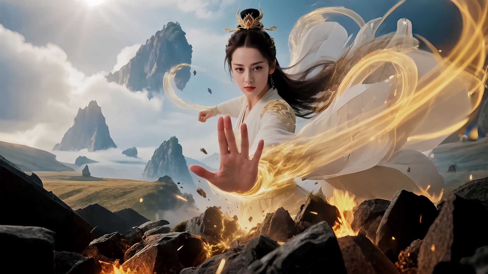 她立在古樟阴影里,白色锦袍素净,眉眼冷得像淬冰,与高台上的李莽并肩时,却漾开浅笑。